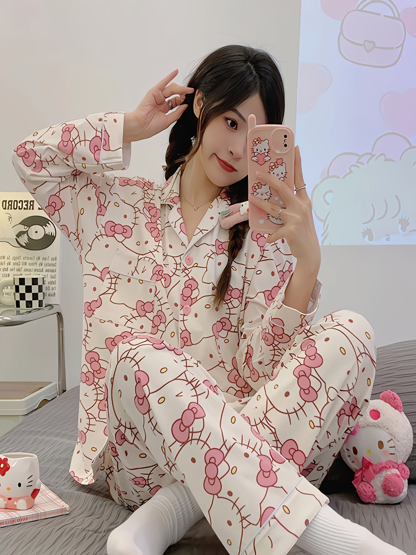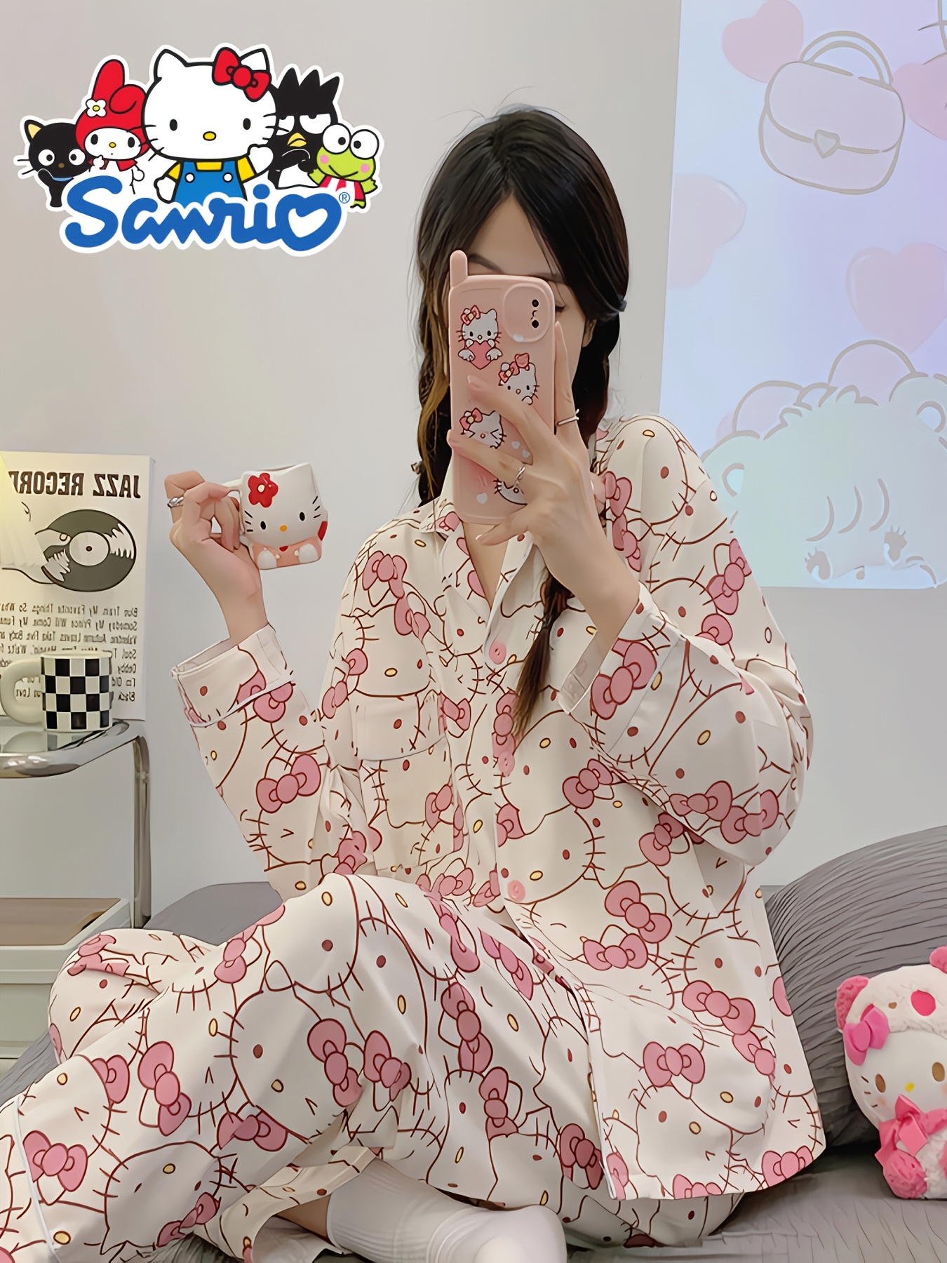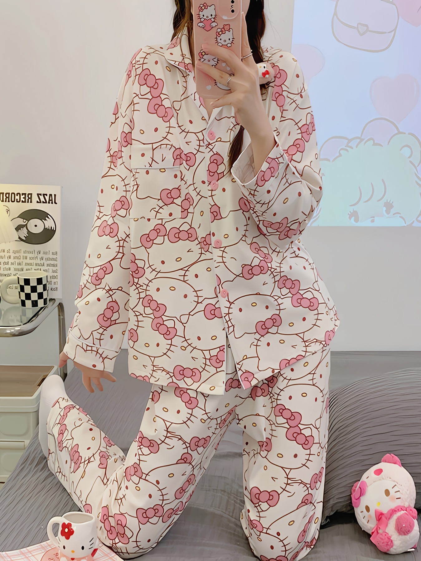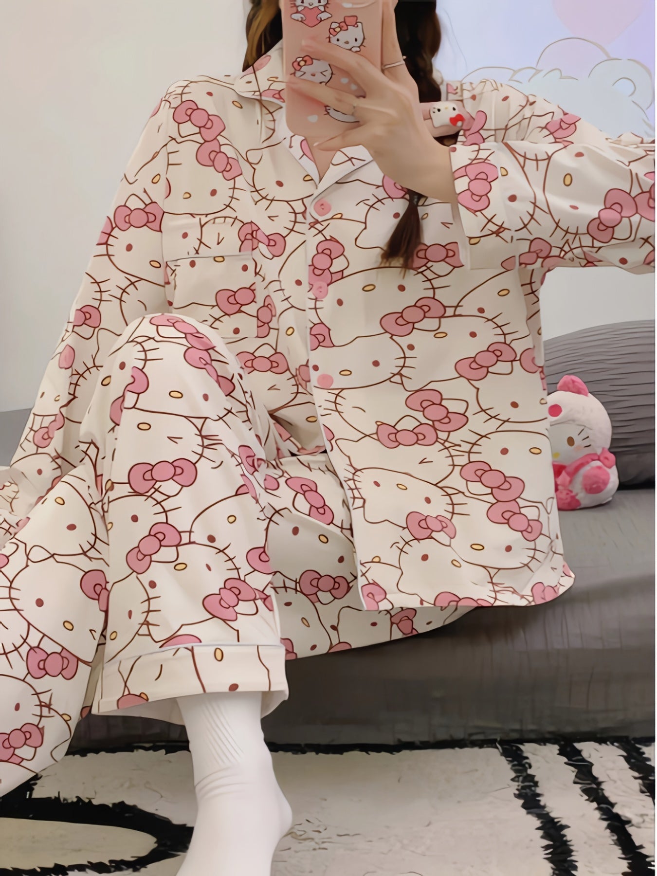 2pcs Sanrio Genuine Authorization, Hello Kitty Cartoon Pajama Set, Spring And Autumn Long-sleeved Set, Long-sleeved Sweet Cartoon Loungewear, Thin Pajama Set, A Must-have Choice for Valentine's Day Gifts for Girlfriends And Family