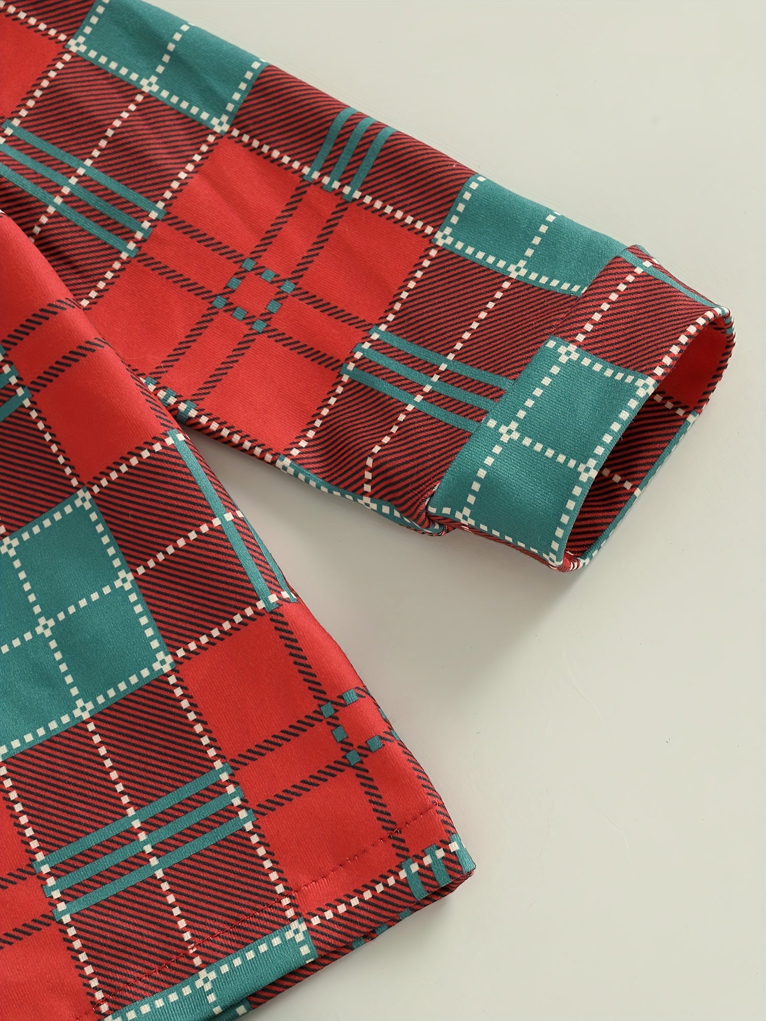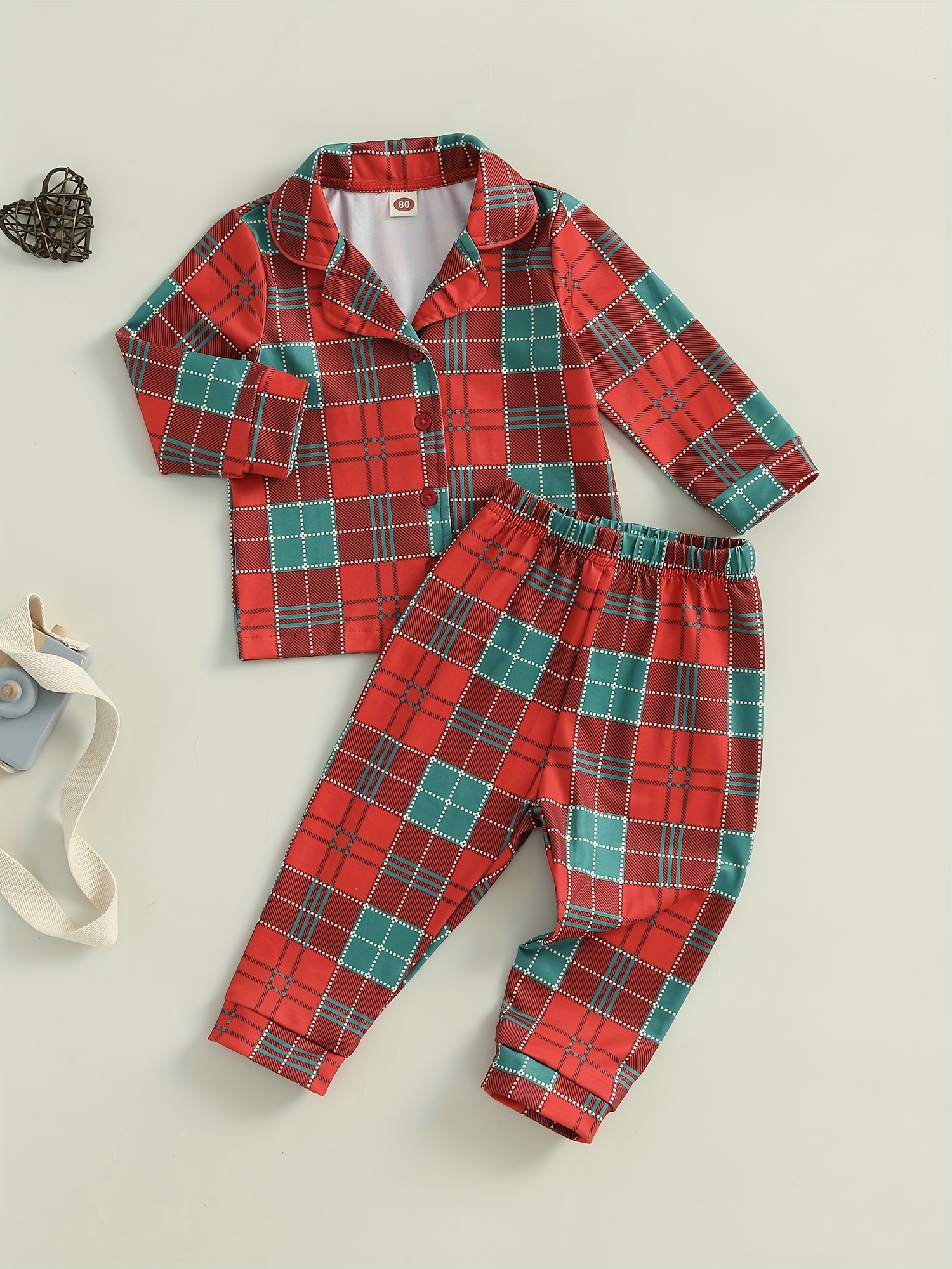 Cozy Cotton Blend Youngsters' Plaid Pajama Set with Button-Up Lapel Top & Long Pants - Cute Christmas Loungewear for Youngsters and Youngsters, Machine Washable